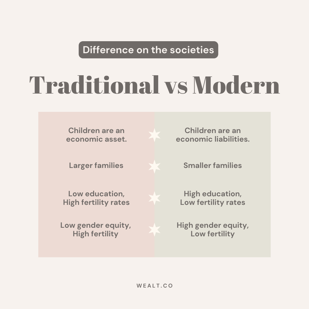 - Social norms and behaviour: Cultural and social norms may encourage larger families in traditional, agrarian societies, where high fertility rates are beneficial. In modern societies, however, cultural norms often shift towards smaller families as the economic role of children changes.