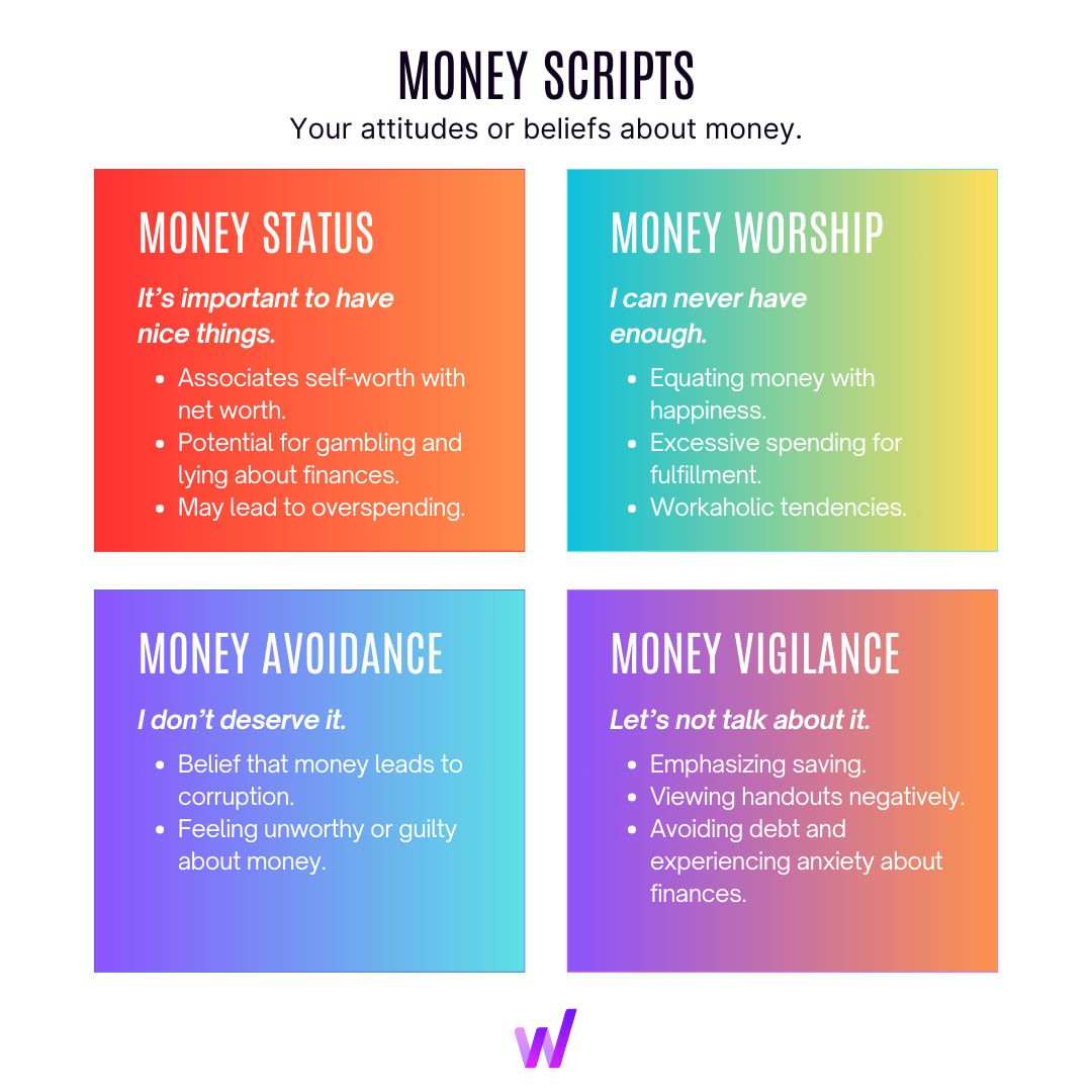 There are 4 money scripts that show your relationship with money: money status, money worship, money avoidance, and money vigilance. These scripts are your attitudes and beliefs rooted in your childhood and impact your current financial life.