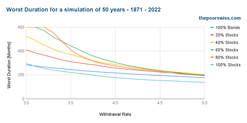 But still, the success rate only tells part of the story. Another quite important metric is the worst duration of a scenario. This means after many months, the first failure can happen. Retirement timing becomes especially pertinent in the context of economic cycles, where savvy individuals consider the impact of market fluctuations on their financial well-being post-retirement. Economic cycles can influence investment returns, and retiring during an economic downturn might expose one's savings to lower initial withdrawal rates, potentially safeguarding the longevity of their portfolio.