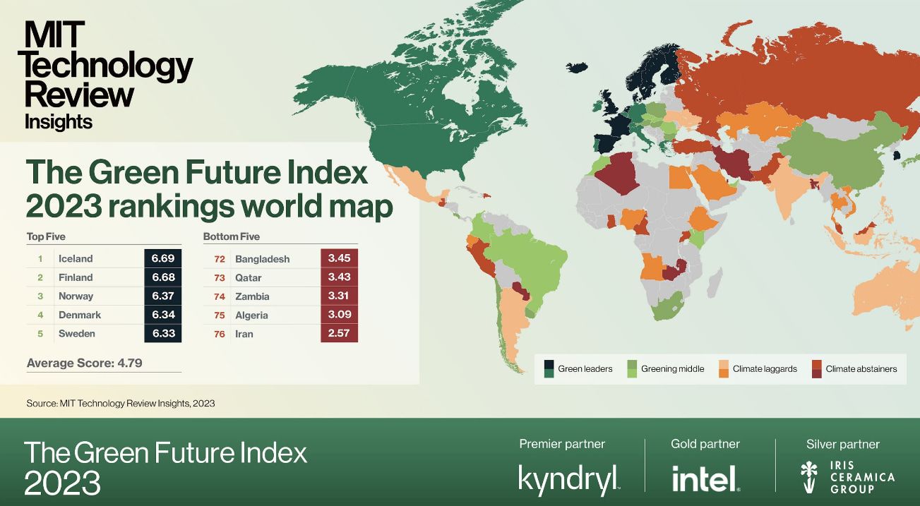 - Nordic countries (Denmark, Sweden, Norway, Finland, Iceland): These countries are known for their commitment to renewable energy and sustainability. Investment in wind power, hydropower and other green technologies is widespread, and the Nordic countries consistently rank high in global sustainability indices. The Nordic countries rank in the top 5 (Iceland is #1) in Technology Review's 2023 Green Future Index, with high scores in clean innovation, carbon emissions and renewable energy use.