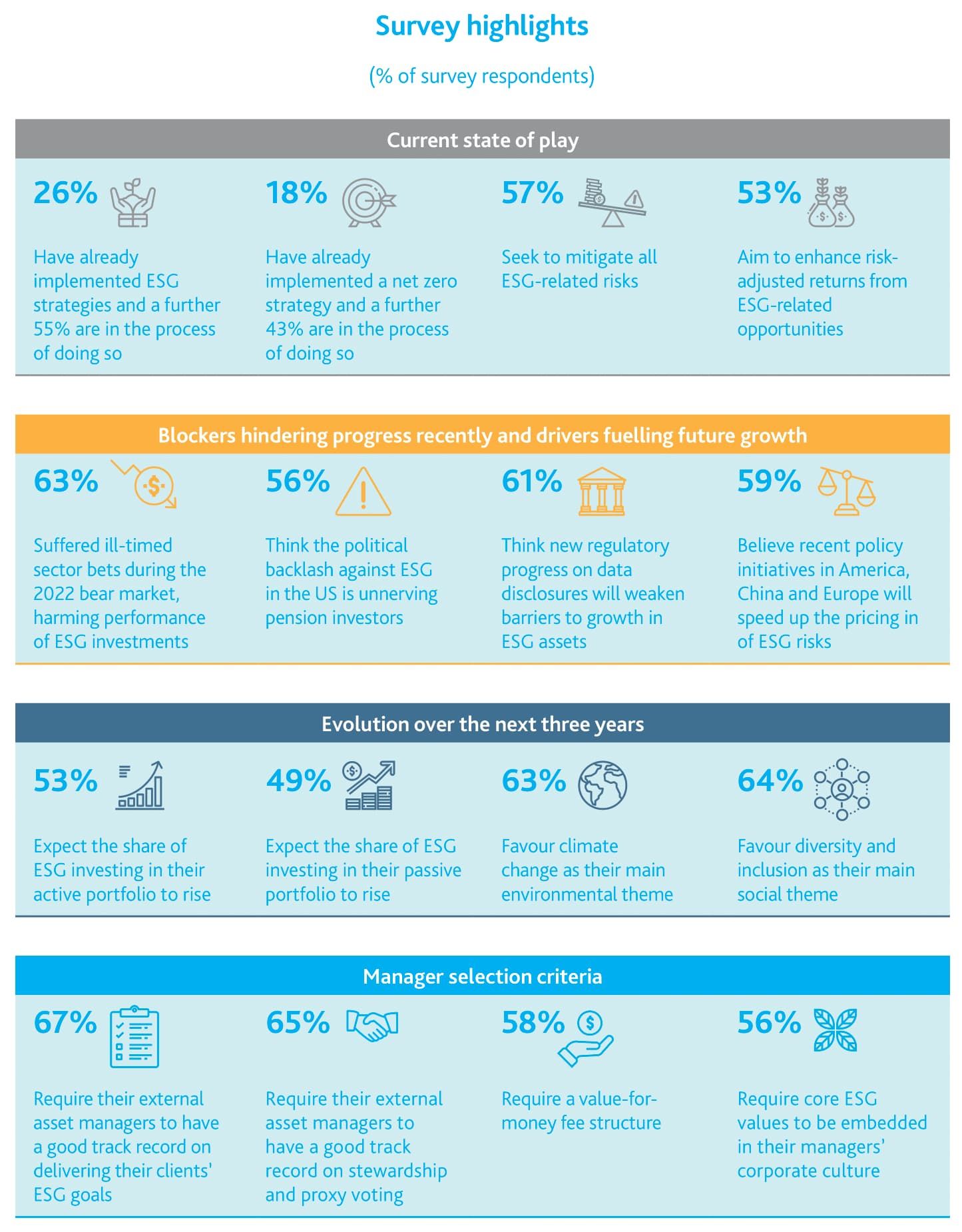 The Amundi Research Center has researched the next stage of ESG development in the pension landscape. One of the key findings is that this is a changing ecosystem. While old-style capitalism focuses solely on profits, the ecosystem is being reshaped with the rise of ESG investing. 18% of the funds surveyed have already implemented a net zero strategy, while 43% are in the process. The survey also reveals the barriers to the process and how managers are selecting for this shift. 53% of funds expect the proportion of ESG investments in their active portfolios to increase.