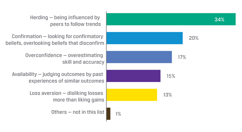 A closer look reveals several cognitive biases that often affect investors, influencing their choices and, in turn, market dynamics. Drawing on insights from a comprehensive survey conducted by the CFA Institute that captured the perspectives of 724 practitioners worldwide, this research sheds light on the five primary biases - herding, confirmation, overconfidence, availability and loss aversion - that commonly shape investor behaviour.