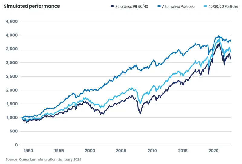 As people have realised how stagnant and inefficient the 60/40 portfolio has become, the 40/30/30 one is gaining popularity among investors and advisors. This new rebalancement offers a distribution of 40% in equities, 30% in bonds, and 30% in the overlooked opportunities of alternative classes to attain growth and income diversification in the present market thesis.