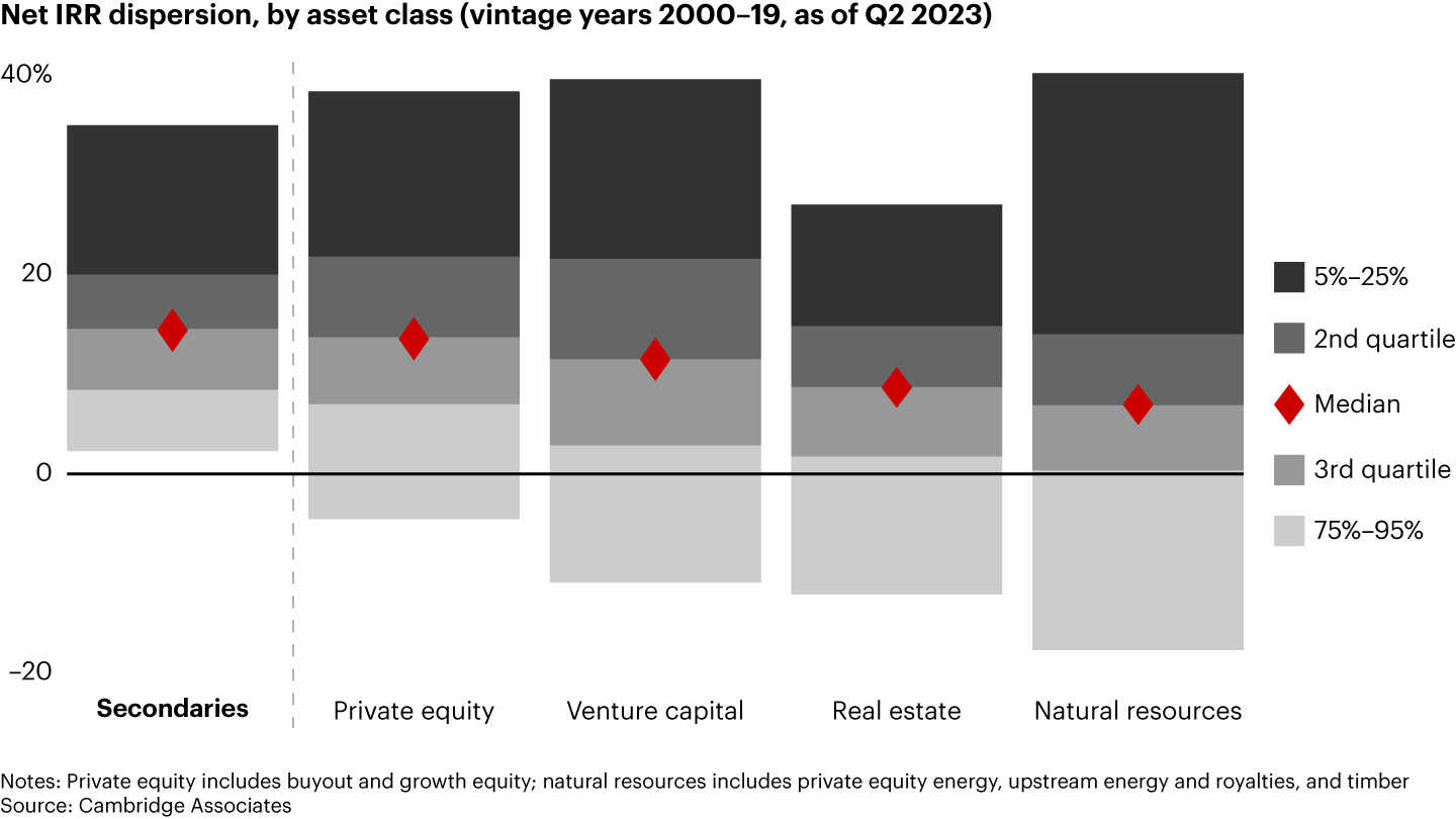- The secondary market has more potential than public markets because it is practical for investors to buy certain assets at much lower prices than their worth and, when they exit, get a much higher return. Even in the alternative investments universe, secondaries have performed better as a strategy than most, with higher IRR median and low dispersion, delivering better risk-adjusted returns and making excellent portfolio diversification for HNWIs and sophisticated investors.