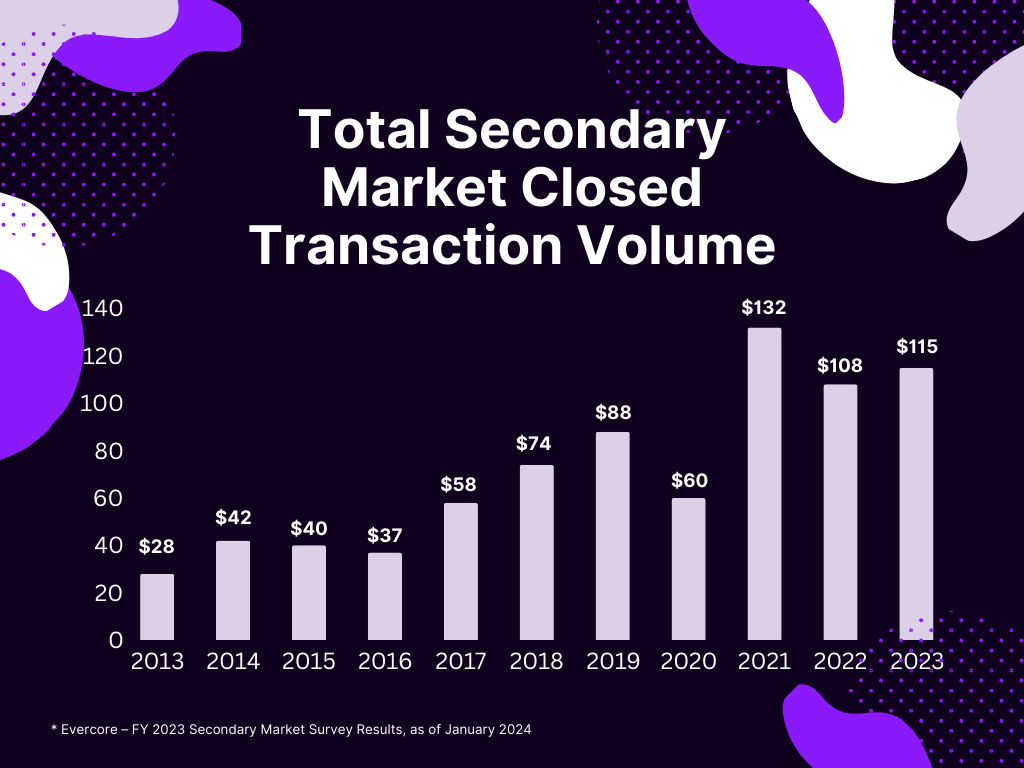 In recent years, we have seen significant growth in the secondary market for private equity and venture capital investments, with 4x market growth in 10 years in the total secondary market closed transaction volume. Also, secondary fundraising hit a record $93.8bn in 2023 and still has plenty of room to grow.