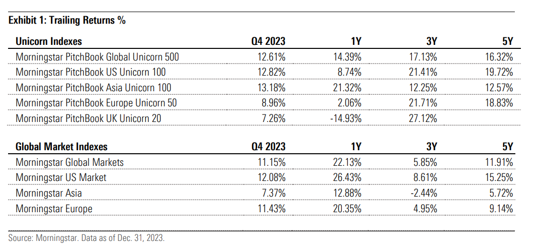 Investing in 50 global startups may generate more returns than ETFs indexing standard equity markets. The Morningstar Unicorn Market Monitor: Q4 2023 shows a 16.32% 5-year return for global unicorn indexes, outperforming global markets' 11.91% 5-year return. Such top startups are typically market leaders or contenders against market leaders in their sub-industry. They are ideally situated to extend their growth rates and capture a big stake in the market share. The US Unicorn 100 and Europe Unicorn 50 indices stand out with 19.72% and 18.83% 5-year returns, respectively, significantly surpassing their corresponding regional market indices. Nevertheless, this strategy entails stringent analysis and possession of pertinent information concerning each company's different risks and opportunities.